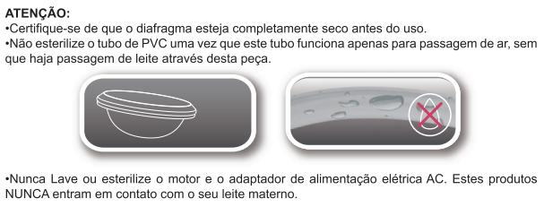 - É recomendado esterilizar a bomba (exceto o motor, tubo PVC e adaptador de alimentação elétrica) utilizando água fervente por 10 minutos ou forno de micro-ondas. Caso utilize, precisará utilizar um recipiente estéril;