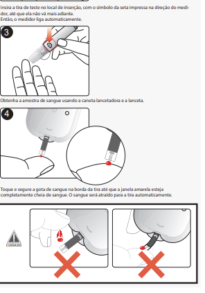 Não coloque o sangue na parte de cima da tira reagente, sempre encoste a ponta da tira na gota de sangue.