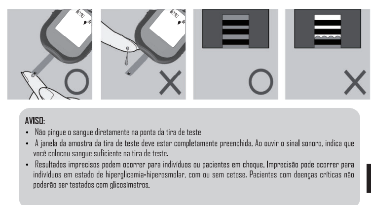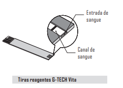 Transfira a gota de sangue para a tira reagente até que esteja completamente preenchida, mas tenha cuidado para não pressionar o dedo contra a tira. O sangue será puxado para a tira de forma automática.